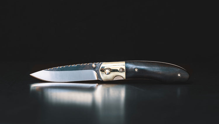 This everyday carry knife kit blends the backwoods with Tron with a razor-sharp smooth and serrated blade. Parts made here in the USA using heirloom quality materials.